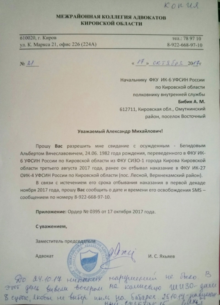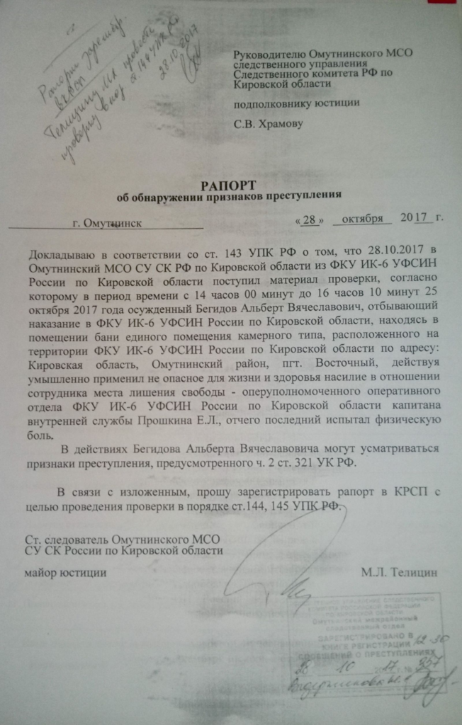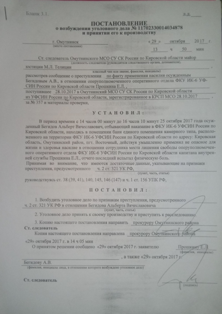29 октября следователь М. Телицин возбудил против Альберта Бегидова дело по статье 321, часть 2. Его обвинили в том, что 25 октября он «умышленно применил не опасное для жизни и здоровья насилие» по отношению к сотруднику ИК-6 Кировской области Е.Л. Прошкина, «отчего тот испытал физическую боль».