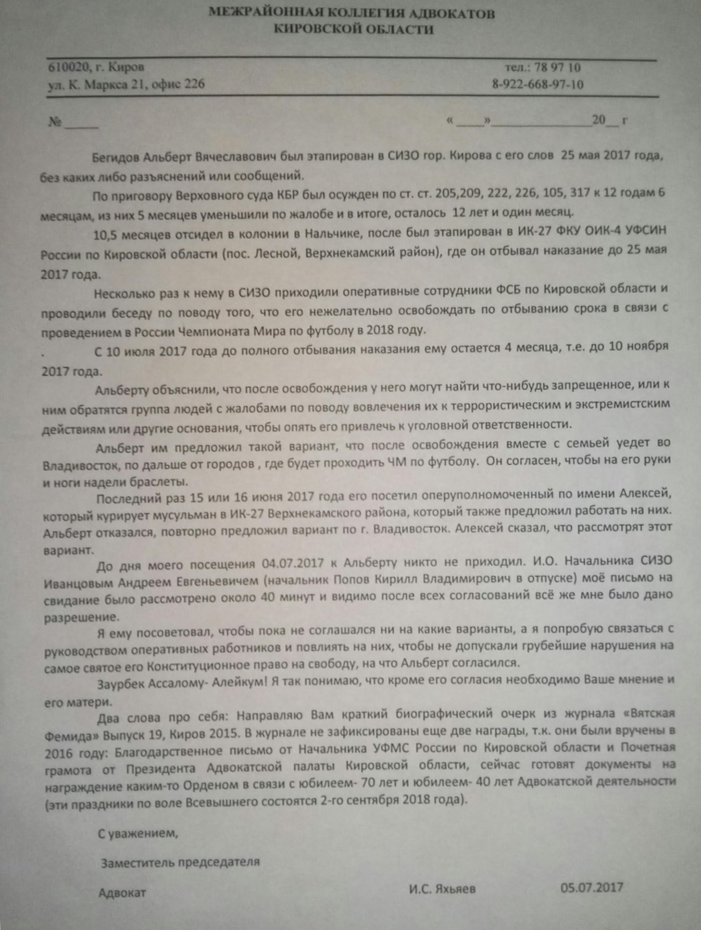 По словам матери, с мая 2017 года ее сына постоянно вывозят из колонии и угрожают, что его не отпустят пока в РФ не закончится чемпионат мира по футболу. Бегидову пригрозили, что у него найдут наркотики или обвинят в любом нарушении, но срок ему будет продлен и лучше вину признать, отсидеть еще два года.