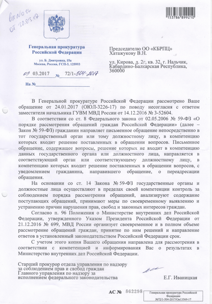 30 марта 2017г. нами был получен ответ от 09.03.2017г. № 72/1-504-2017 за подписью Старшего прокурора отдела управления по надзору за соблюдением прав и свобод граждан Главного управления по надзору за исполнением федерального законодательства Е.Г. Иваницкой, из которого следует, что на основании ст. ст. 8, 14 ФЗ №59 от 02.05.2006г. «О порядке рассмотрения обращений граждан Российской Федерации» наше заявление в соответствии с компетенцией было переадресовано в Министерство внутренних дел Российской Федерации.