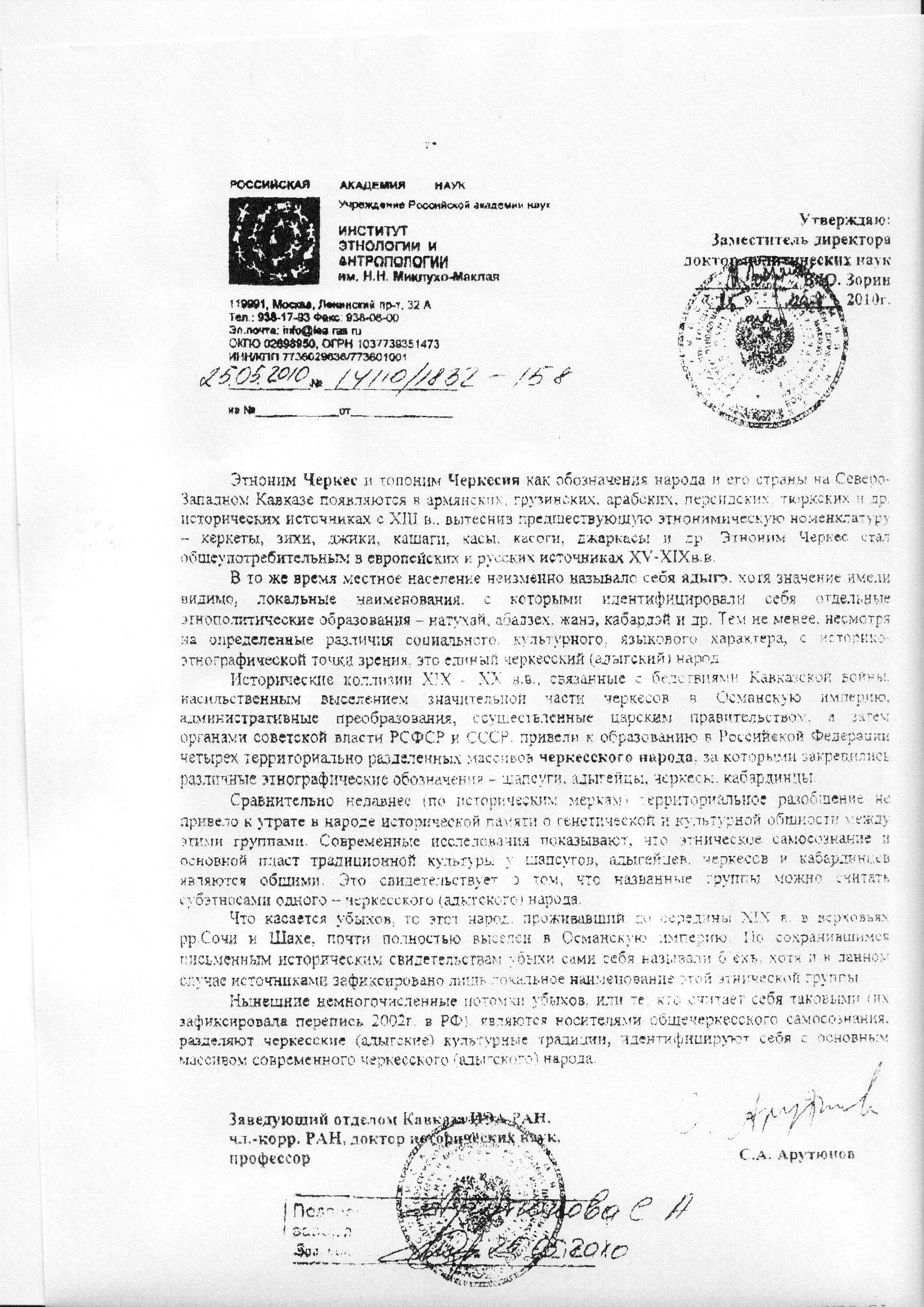 Для уточнения понятий, под экзоэтнонимом «черкесы», согласно Заключения Института этнологии и антропологии им. Н.Н. Миклухо-Маклая РАН от 25.05.2010 г. N14110/1832-158 (копия прилагается), далее в тексте мы рассматриваем представителей различных этнографических общностей, как то: кабардинцев, черкесов Карачаево-Черкесии, адыгейцев Республики Адыгея и шапсугов, принадлежащих к одному народу.
