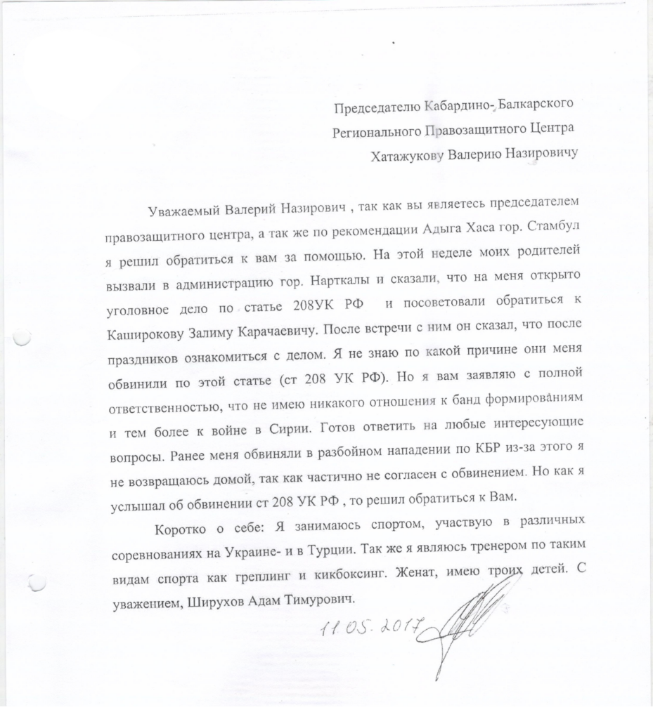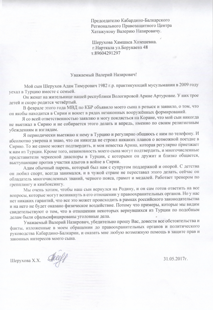 В Правозащитный центр обратилась жительница г. Нарткалы Ширухова Хамшаса Хазешевна. Ее сын, Шерухов Адам Тимурович с 2009 года живет и работает в Турции. «В феврале этого УМВД по КБР объявило моего сына в розыск и заявило о том, что он якобы находится в Сирии и воюет в рядах незаконных вооруженных формирований» — пишет она в своем обращений. Ширухова Х.Х. утверждает, что ее сын никогда не выезжал в Сирию и не собирается этого делать и впредь и именно по своим религиозным взглядам и убеждениям.