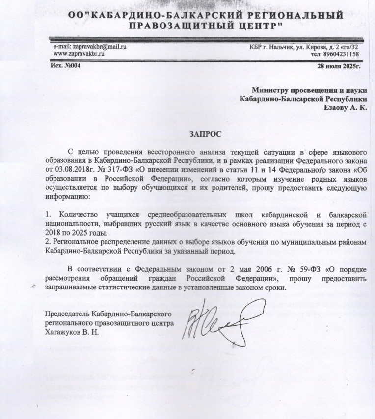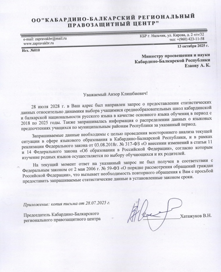 28 июля текущего года мы направили официальный запрос, однако не получили ожидаемого ответа. В связи с этим 13 октября мы повторно обратились к министру Минпросвещения и науки КБР Езаову А. К. с настоятельным требованием предоставить исчерпывающую информацию о количестве учащихся, выбравших русский язык в качестве родного за все годы после принятия поправок в ФЗ Об образований.