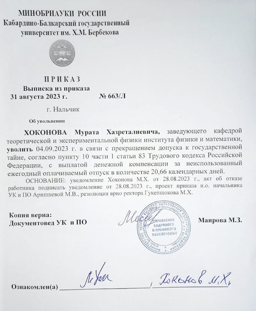 Я был уволен из КБГУ 04.09.2023 г. «в связи с прекращением допуска к государственной тайне». Повод для увольнения – моя трёхдневная поездка в Турцию. Увольнение я считаю незаконным и буду добиваться моего восстановления в должности заведующего кафедрой теоретической и экспериментальной физики и членства в учёном совете КБГУ.