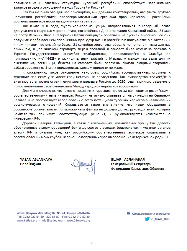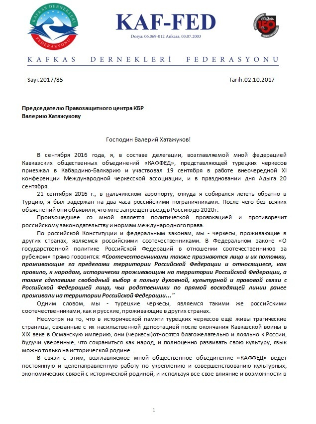 В Кабардино-Балкарский правозащитный центр поступило обращение руководителя крупнейшей черкесской организаций в Турций «КАФФЕД» Яшара Асланакая, депортированного из России 20 сентября 2016 года. В отношении него ФМС России был наложен на 4 года запрет на посещение исторической родины. Выдворение Асланакая вызвала волну возмущения и критики на Северном Кавказе и в кавказских диаспорах по всему миру. Руководство «КАФФЕД» в декабре прошлого года выступило с осуждением депортации Яшара Асланакая и объявило о начале процедуры выхода из Международной Черкесской Ассоциации. Многие эксперты, аналитики, общественные деятели, отслеживающие эту ситуацию отмечают, что не совсем ясна позиция официальных органов властей России и кому выгодна провокация с депортацией Яшара Асланакая – политика, известного пророссийскими взглядами, за что неоднократно и жестко подвергается критике.