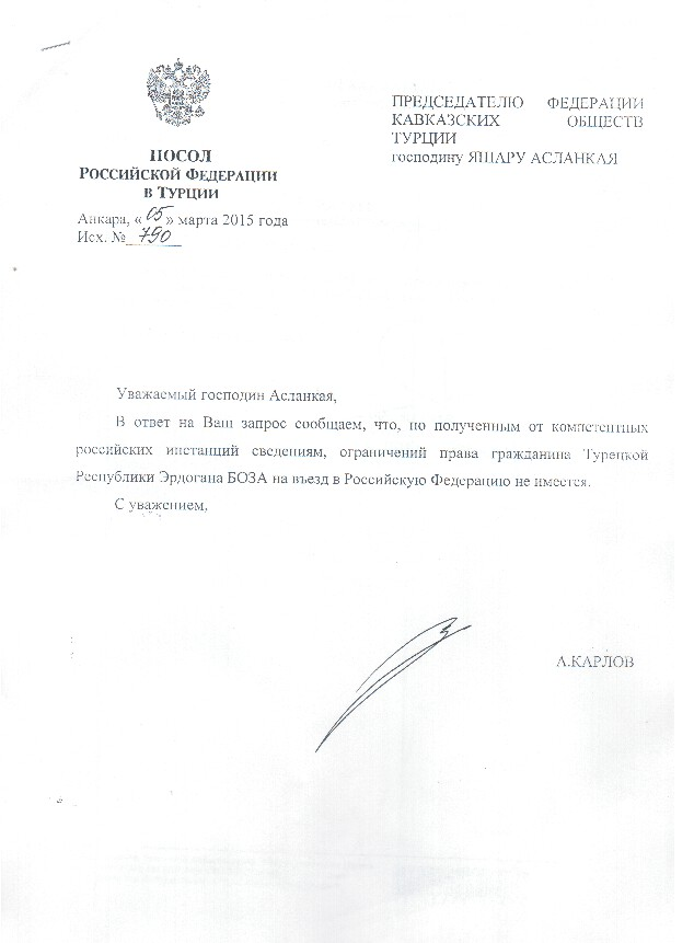 Мы неоднократно писали о том, что 25 ноября 2014 г. гражданину Турции этническому черкесу Эрдоган Гут (Боз), который направлялся в Карачаево-Черкесию для участия в Конференций посвященной памяти черкесского фольклориста Михаила Мижаева не разрешили въехать в Россию. В акте о депортации Гут Эрдогана из аэропорта Минеральные воды записано, что ему запрещен въезд в Россию до 19 августа 2015 г. . В ответах полученных по запросу Правозащитного Центра в МИД РФ, Генеральную прокуратуру, Миграционную службу РФ, говорится, что ни каких ограничений для въезда Гут Эрдогана в Россию нет. Публикуем текст ответа посла России в Турции на обращение руководителя Федерации черкесских землячеств Хасэ – КАФФЕД Яшар Асланкая по делу Гут Эрдогана.