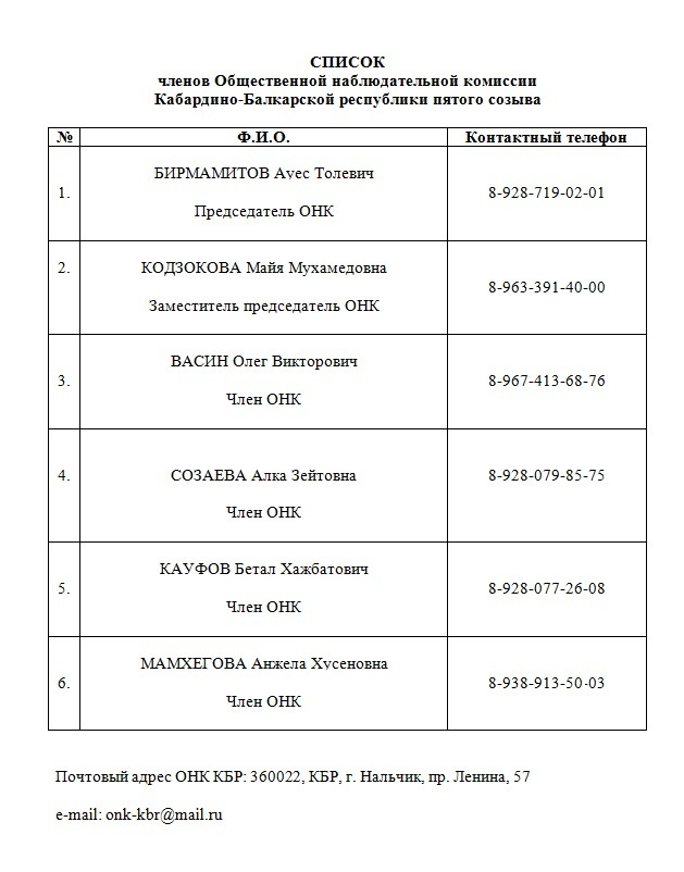 В эти дни к нам поступило множество обращений от журналистов, представителей правозащитных организаций интересующихся ситуаций в нальчикском СИЗО, с просьбой помочь связаться с членами ОНК КБР. Как правило, информация о составе ОНК публикуется на сайте Общественной палаты региона, либо имеет свой сайт. Мы не смогли найти такую информацию на сайте ОП КБР, в связи с чем, считаем необходимым разместить список членов ОНК КБР пятого созыва.