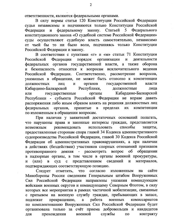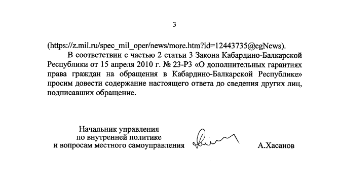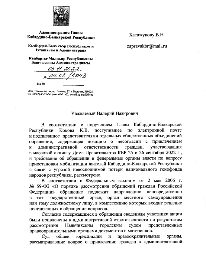 На обращение представителей общественности республики к Главе КБР с просьбой оградить от административного преследования участников схода у здания правительства КБР 25-26 сентября 2022г., выступивших против порядка ведения частичной мобилизации в республике, нами 3 ноября 2022г. было получено письмо за подписью А.Хасанова — начальника управления по внутренней политике и вопросам местного самоуправления.