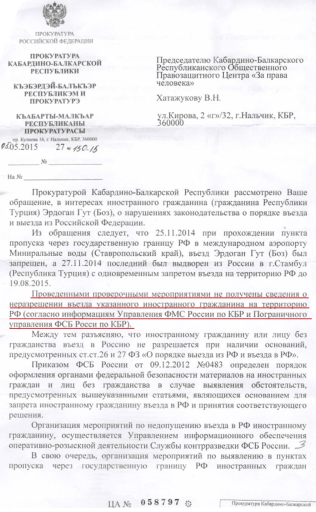 24 ноября 20014 г. черкесского ученого — антрополога Гут Эрдогана, направлявшегося из Турции в Карачаево –Черкессию для участия в научной конференций посвященной памяти черкесского фольклориста Михаила Мижаева не пустили в Россию. Правозащитный Центр обратился в федеральные правоохранительные органы с просьбой — объективно разобраться во всех обстоятельствах произошедшего инцидента и оказать Гут Эрдогану всяческое содействие в восстановлении его права посещать историческую Родину. Публикуем ответ, полученный из прокуратуры Кабардино-Балкарии на обращение в Генеральную прокуратуру РФ.