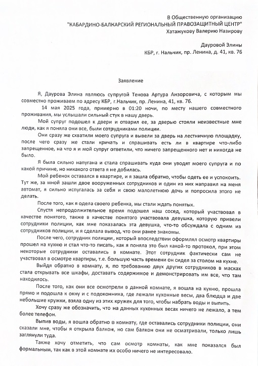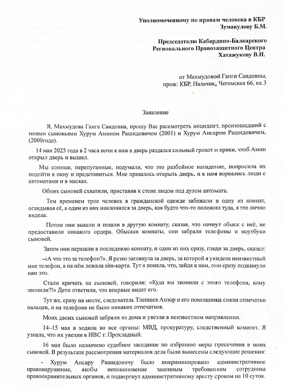 В правозащитный центр обратились шесть жителей республики в защиту своих родственников, подвергшихся задержанию правоохранительными органами Кабардино-Балкарской Республики ночью 14 мая 2025 года.