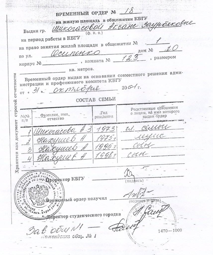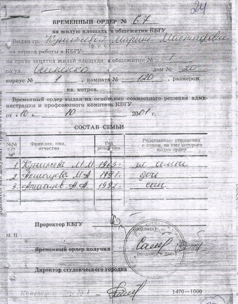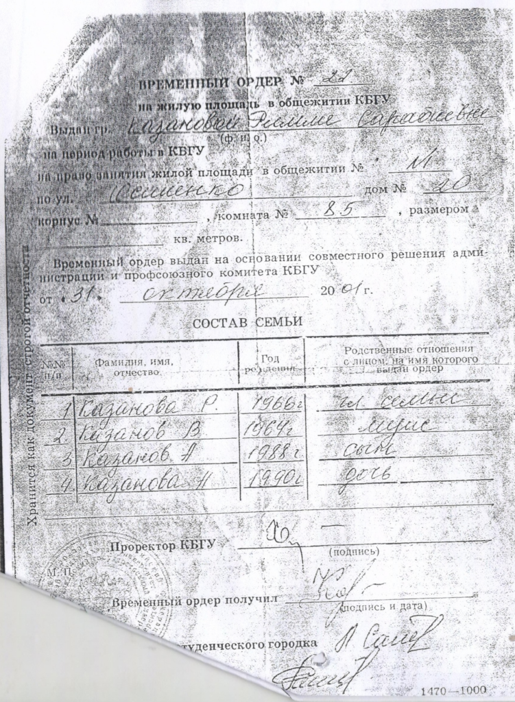 Мы все бывшие сотрудники, живущие здесь работали в КБГУ за мизерную зарплату, стояли в очереди ради получения жилья, и уволились принудительно, по собственному согласию, так как нам обещали, что нас не выселят из общежитии и передадут Администрации города с дальнейшей приватизацией. У некоторых из нас сохранились некоторые чеки по проведенному ремонту, справки о том, что стояли на очереди для получения жилья.