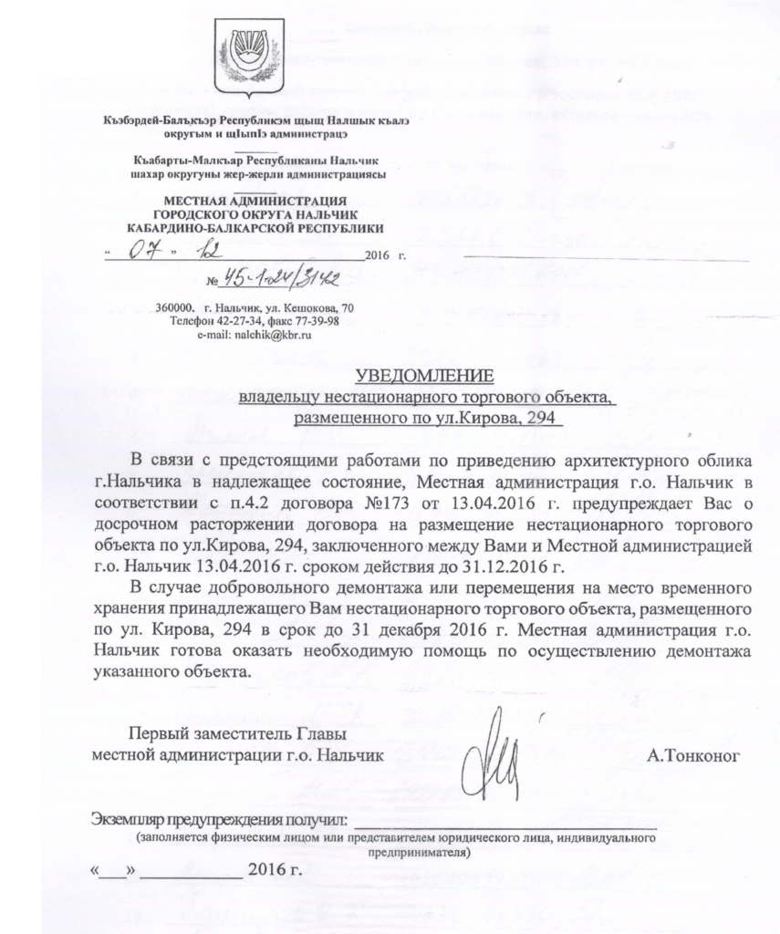 Мы начали получать уведомления Администрации города Нальчика о досрочном расторжении договора аренды земли с формулировкой «В связи с предстоящими работами по приведению архитектурного облика г. Нальчика в надлежащее состояние». Мы тоже рады видеть и показывать гостям ухоженные улицы нашего города, и если есть проект и в 2017 году запланированы работы по нашему участку улицы мы будем вынуждены подчиниться.