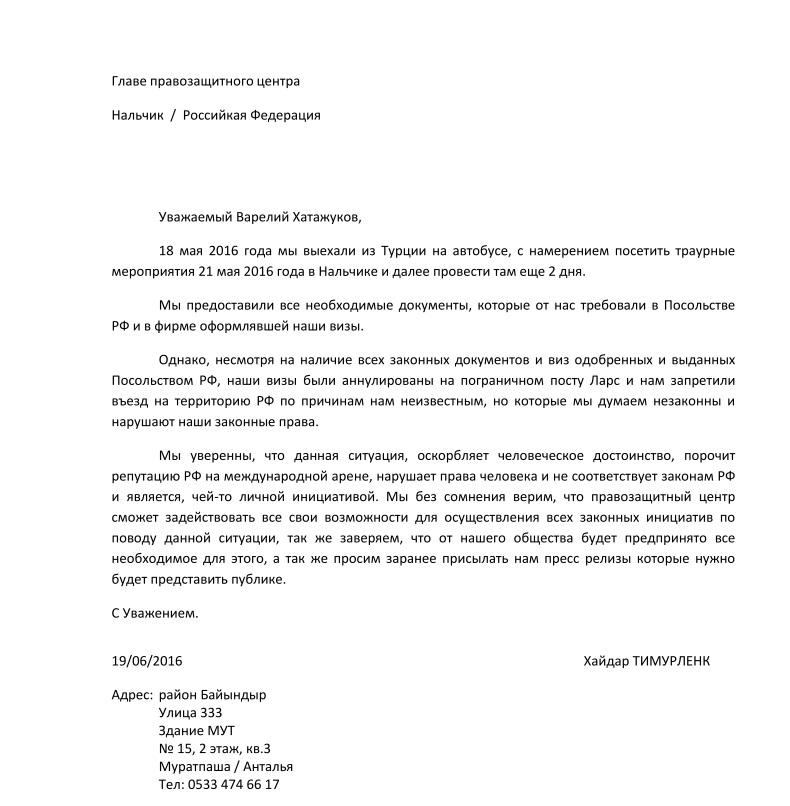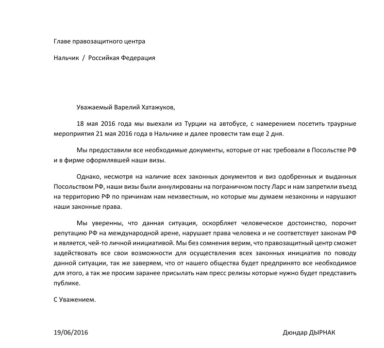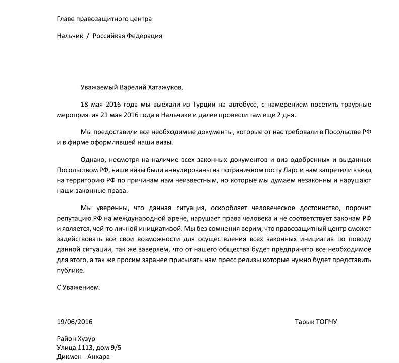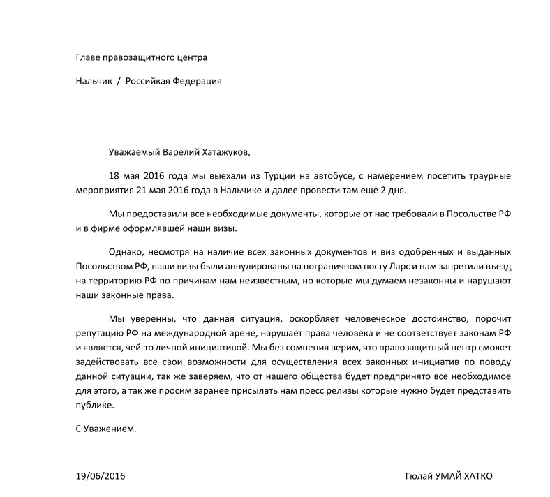 Публикуем обращения в правозащитный центр черкесских соотечественников (русский перевод)