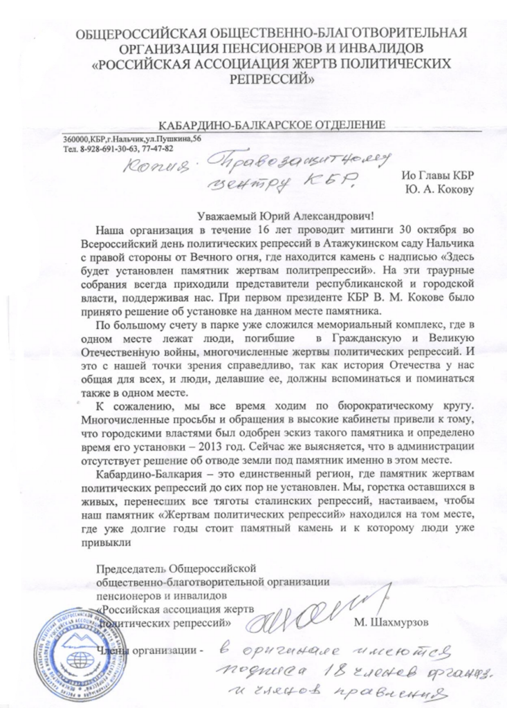 Юрий Александрович, учитывая общественную и политическую значимость вопросов, связанных с политическими репрессиями на территории Кабардино-Балкарии, просим Вас организовать встречу с представителями «Ассоциации жертв политических репрессии», интеллигенции, общественных объединений  для  обсуждения путей решения обозначенных проблем.