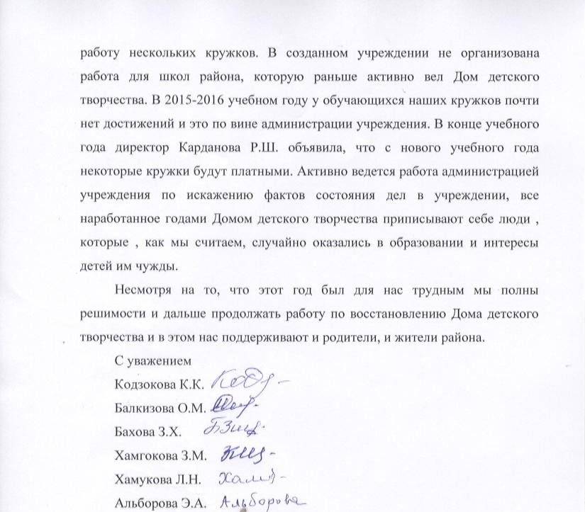Приложение: копия заявления сотрудников Дома детского творчества Урванского района КБР