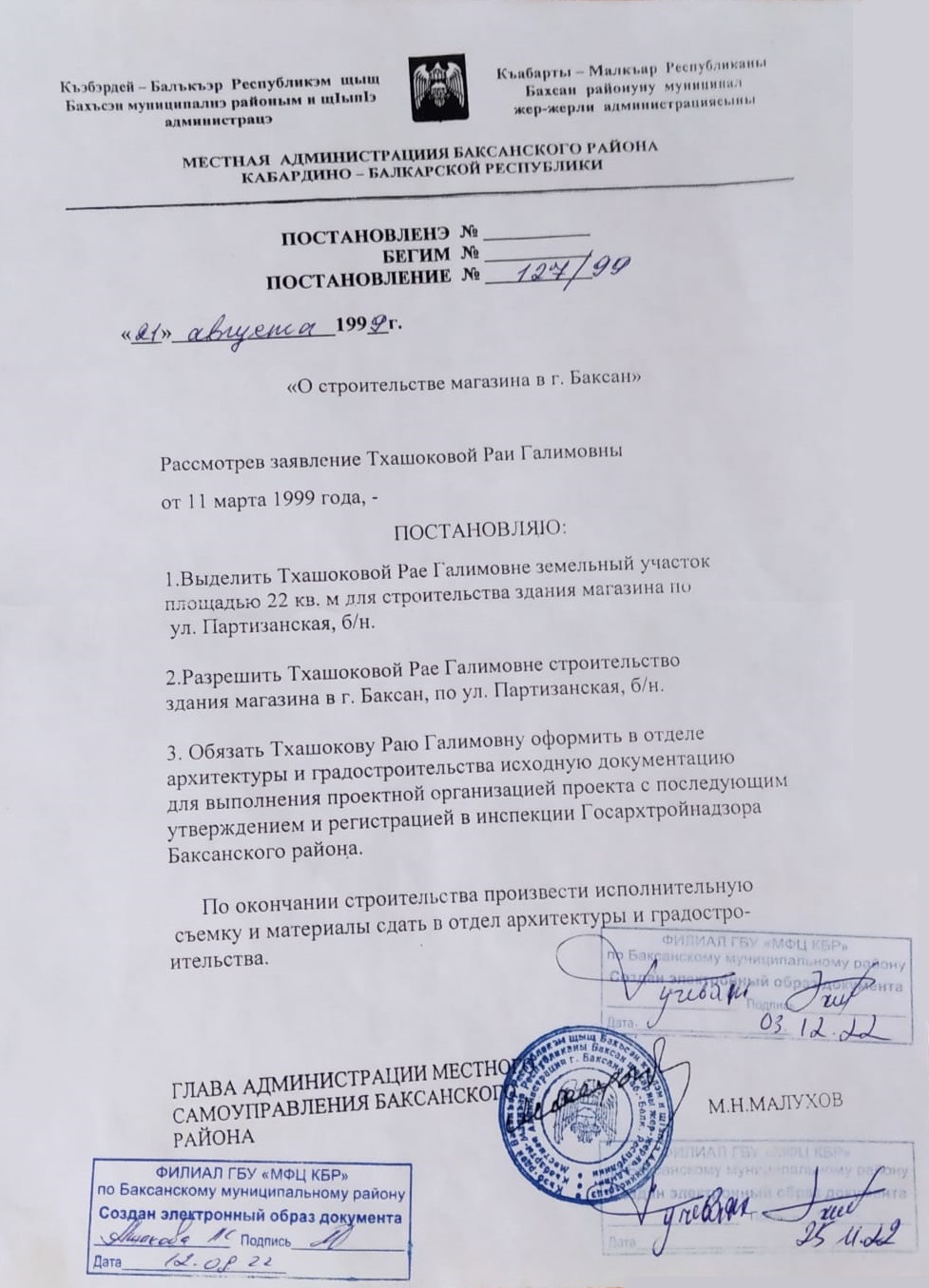 В 2022 г. рядом с моим магазином (общей площадью 22 кв.м.), расположенный в г. Баксане по ул. Партизанская б/н, началось строительство торгового центра. По соседству со мной, на части застраиваемой территории также располагались несколько торговых точек небольшой площади, которые впоследствии были признаны самовольной застройкой, и в связи с отсутствием разрешительных документов были снесены.