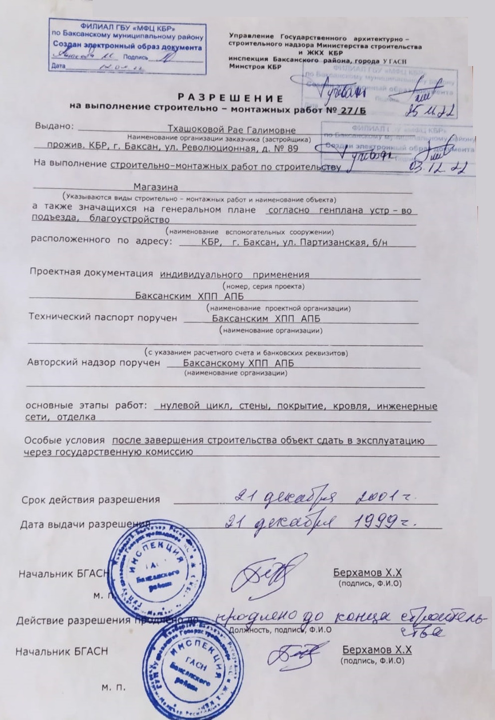 —разрешение на выполнение строительно-монтажных работ №27/Б от 21.12.1999г;