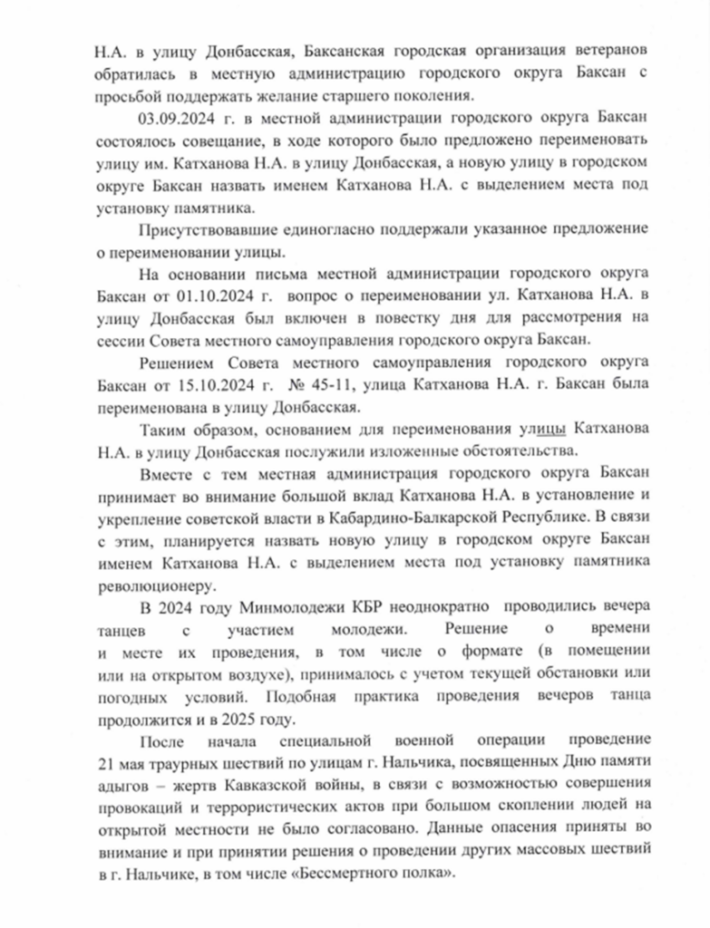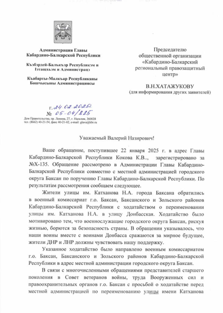 В решении Совета местного самоуправления г.о. Баксан, принятом 15.10.2024 г., о переименовании улицы Катханова, протокол которого опубликован в социальных сетях, ни слова не говорится о подобных обращениях. Они «появились» со слов представителей администрации города Баксана лишь спустя два месяца после того, как возмущенные представители общественности начали громко заявлять о том, что такое переименование незаконно, оскорбляет национальные чувства и компрометирует всё, что связано с СВО, и в первую очередь сами республиканские органы государственной власти.