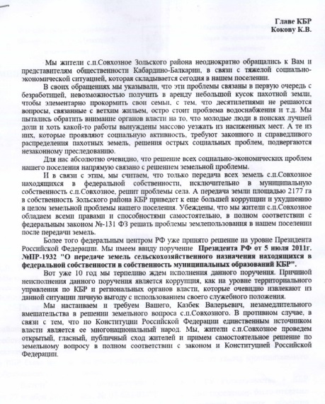 4. Копия обращения жителей с.п.Совхозное к Главе КБР