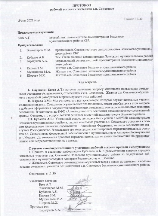 19.05.2022 г. мы обратились в администрацию Зольского района. По итогам нашей встречи был составлен протокол (прилагается к письменному обращению). При этом жители Совхозного живут в крайней бедности, и не могут получить даже 1 га земли. Молодежь с.п. Совхозное покидает родные места в поисках работы. В итоге, несмотря на все наши просьбы и сажают и обрабатывают арендаторы. Просим Вас разобраться в нашем вопросе, мы еще верим в справедливость государства.